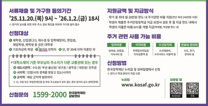 - 월세·관리비·공과금 등 실비를 보전해 주거비 걱정을 덜 수 있어, “공부 + 아르바이트 + 생활비 걱정”이라는 삼중고에서 벗어날 수 있다.